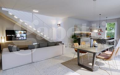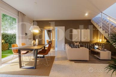 Inserita in un contesto privato, l'abitazione si sviluppa su due livelli ed è circondata da un ampio giardino esclusivo di 156 mq, fruibile attraverso una grande vetrata scorrevole che valorizza la luminosità e crea continuità tra gli spazi interni ed esterni.