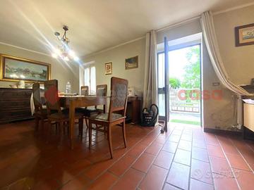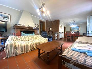 Salendo al primo piano si accede all'appartamento principale, che si apre su un ampio soggiorno con accesso diretto al terrazzo, dal quale si gode una suggestiva vista sulle colline circostanti.