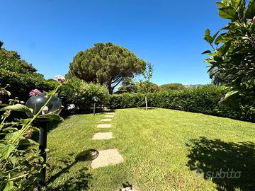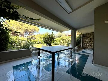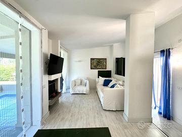 Una luminosa zona giorno con camino, dotata di zona pranzo con tavolo a scomparsa e angolo relax con divani e tv, affaccia su una doppia veranda di generose dimensioni, ideale per rilassarsi nelle ore più calde della giornata, che guarda sul curatissimo giardino verde da cui si può godere di uno scorcio di vista mare.