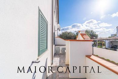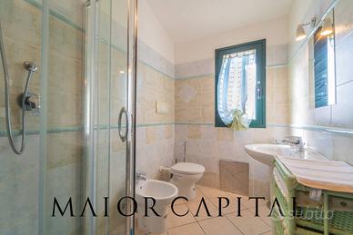Una scala interna accompagna al piano superiore, dedicato alla zona notte, dove troviamo una camera matrimoniale e una seconda camera di ampia metratura, attualmente predisposta per quattro posti letto e facilmente personalizzabile in base alle proprie esigenze. Il livello è servito da un bagno finestrato completo di doccia. Completano la proprietà un posto auto scoperto e una pratica doccia esterna, particolarmente comoda al rientro dalla spiaggia durante la stagione estiva.