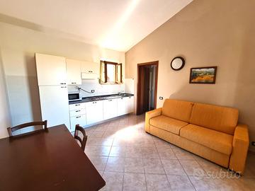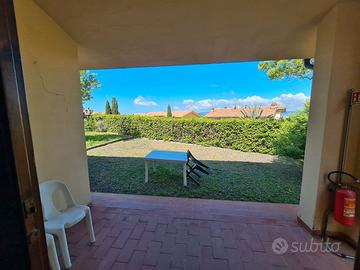 POMAIA All'interno di un villaggio turistico, con accesso controllato, proponiamo questa graziosa villetta indipendente con giardino privato che si estende su tre lati e posto auto, una soluzione UNICA, all'interno del Residence. L'abitazione, in buone condizioni d'uso, è composta da porticato di ingresso, soggiorno/pranzo con cottura, disimpegno, camera da letto e bagno con doccia. Gli arredi sono inclusi nella vendita Il riscaldamento è autonomo con caldaia a metano, piscina condominiale. All'interno del Residence, formato da circa 50 unità immobiliari, è presente un ristorante. Spese condominiali circa 1.000 euro annue