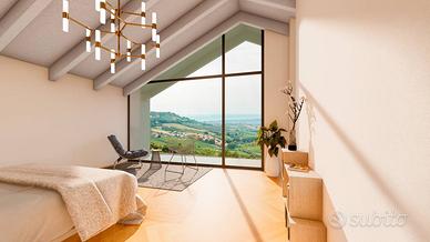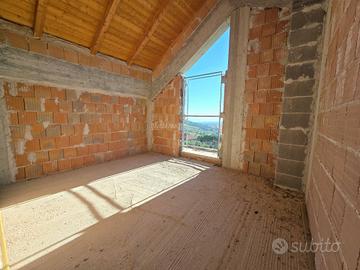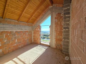 Piano terra: delle dimensioni di mq 61, vista su ampio soggiorno con cucina abitabile open space (volendo divisibile), ampia e luminosa vetrata, bagno, corte pavimentata e giardino;Piano primo di mq 52: composto da tre camere da letto di cui una matrimoniale, una doppia ed una singola / studio, bagno, ampie vetrate panoramiche, tre balconi rispettivamente di 21 mq, 9 mq e 7 mq con vista panoramica sul mare e sulle montagne circostanti.Garage 20 mq al piano terra, da cui si può accedere direttamente all'interno dell'unità abitativa.